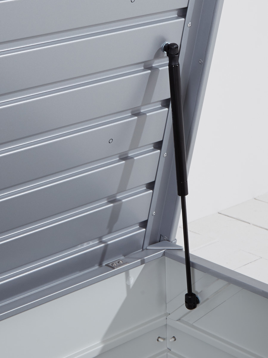 Het deksel opent soepel dankzij gasveren en blijft stabiel in open stand staan. Ook wanneer de LoungeBox direct tegen een muur wordt geplaatst, kan het deksel probleemloos worden geopend. De geïntegreerde ventilatie zorgt voor voldoende luchtcirculatie en helpt condensvorming te beperken, wat vooral bij het opbergen van kussens belangrijk is.