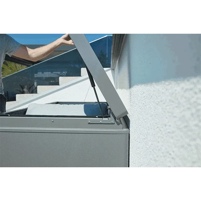 Aluminium deksel met gasveren voor comfortabele opening, geïntegreerde ventilatie, regenwaterdichte metalen constructie en een strakke, onderhoudsvrije afwerking zonder zichtbare schroeven of klinknagels.