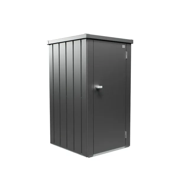 Zijwanden, deur en dak uit vuurverzinkt, polyamide gebrandlakt staal en corrosiebestendige schroeven en bevestigingsmaterialen.
