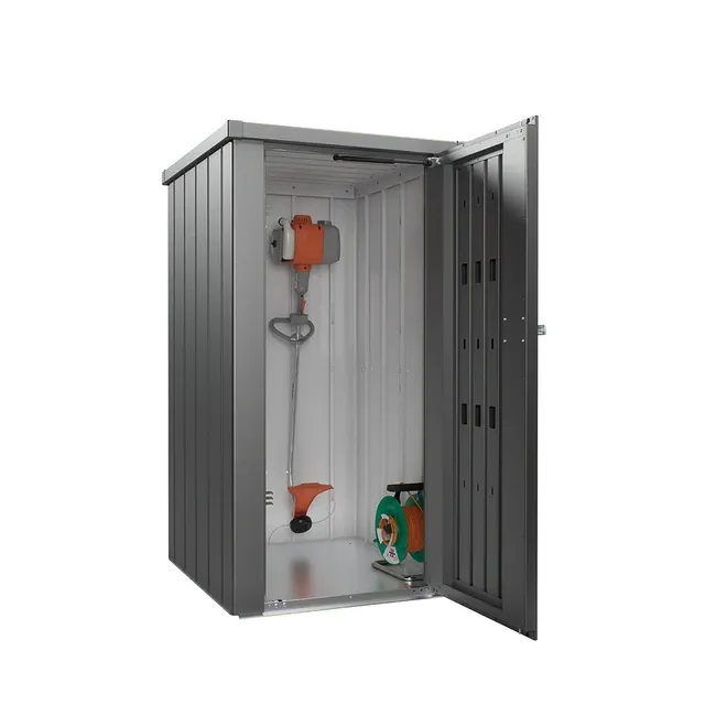 Enkele deur met gasveer voor comfortabele opening, legplank, ophangsysteem aan de binnenzijde van de deur inclusief haken, 2-voudige vergrendeling met cilinderslot, geïntegreerde ventilatie en een regenwaterdichte, onderhoudsvrije constructie.
