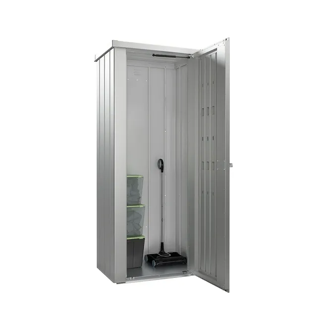 Enkele deur met gasveer voor comfortabele opening, legplank, ophangsysteem aan de binnenzijde van de deur inclusief haken, 2-voudige vergrendeling met cilinderslot, geïntegreerde ventilatie en een regenwaterdichte, onderhoudsvrije constructie. |