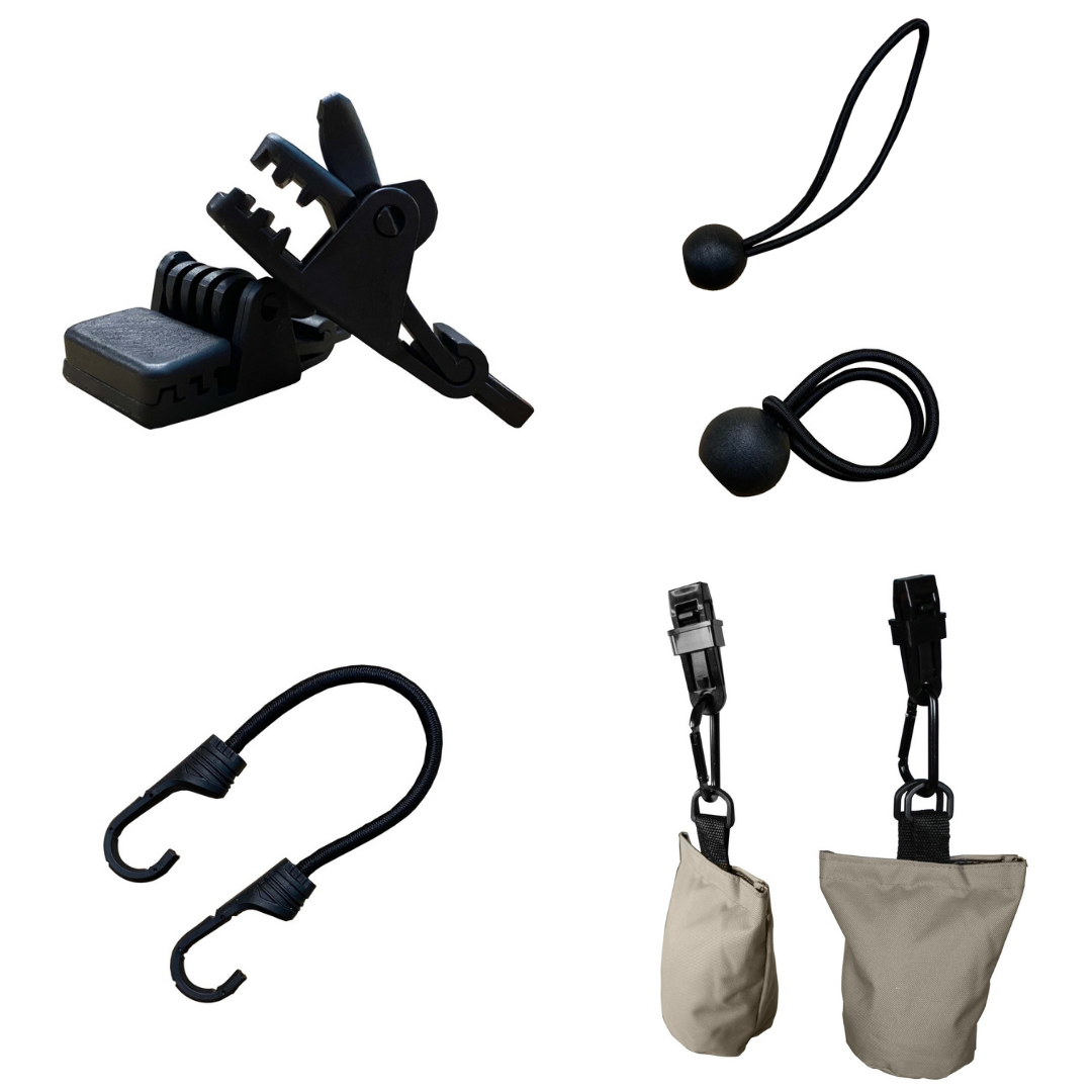 Bekijk onze categorie met accessoires en kies voor klemmen, haken, spanelastieken, bungee-balls en zandzakjes.