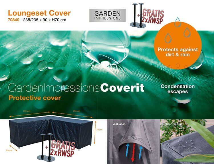 De hoezen van CoverIt zijn gemaakt van Ribstop Polyester met PU-coating. Dit materiaal is sterk en licht, water- en weerbestendig, vuil- en schimmelwerend. Door het gebruik van extra airvents wordt een goede ventilatie gewaarborgd. Condensvorming is mogelijk. Om te voorkomen dat door verstikking uw tuinset beschadigt, adviseren wij een Water Shedding Pole te gebruiken, hiermee creëert u ruimte en luchtcirculatie tussen de meubels en de hoes. Dit zorgt er tevens voor dat er geen water op uw hoes blijft staan. Het gebruik van een beschermhoes is een tijdelijk oplossing. Wij adviseren altijd de kussens droog op te bergen als u langere tijd geen gebruikt maakt van uw tuinset. Nooit uw tuinset, parasol, bbq of kussens nat af dekken. Hierdoor kan schimmel ontstaan.