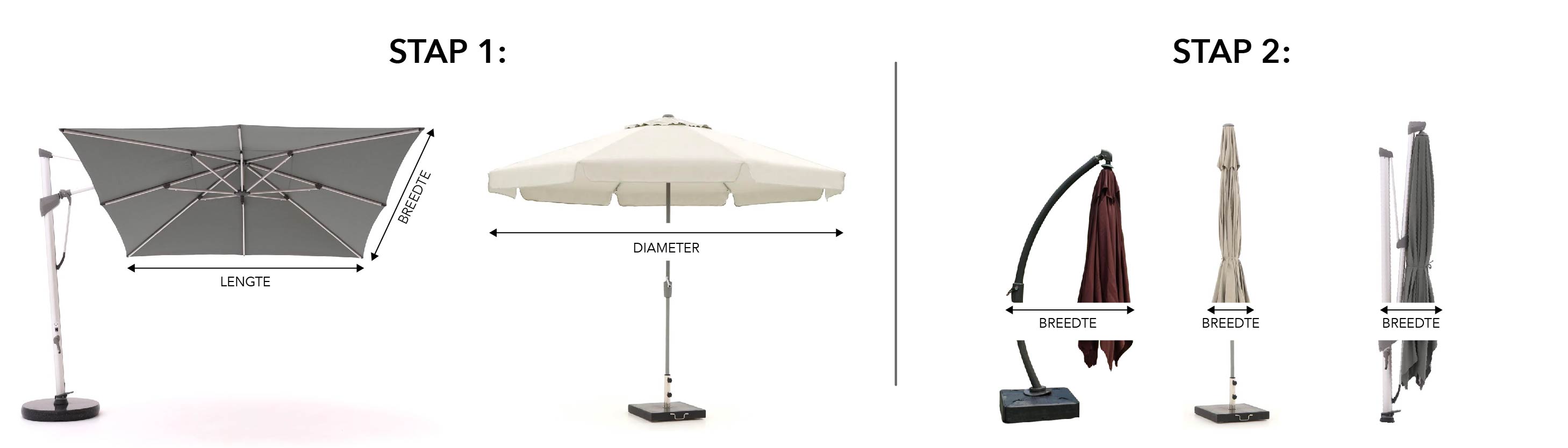 Door de volgende twee stappen te doorlopen vindt u een perfect passende parasol hoes.