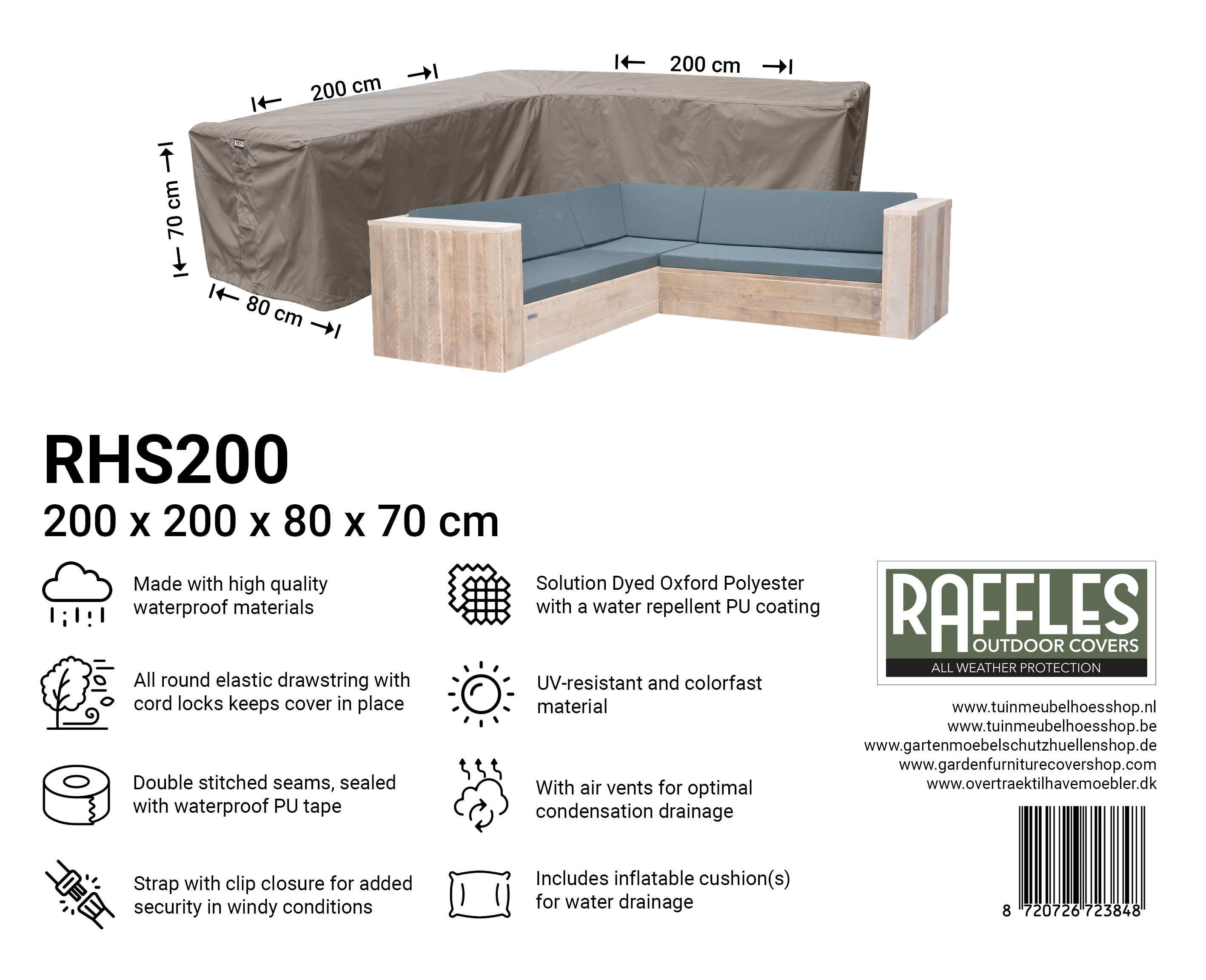 Met de RHS-serie hoekbankhoezen van Raffles Covers beschermt u uw lounge hoekbank of loungeset in L-vorm, van compact tot XXL, het hele jaar door. Of de hoekbank nu op het terras, balkon, onder een overkapping of in de open tuin staat: uw set blijft beschermd tegen regen, vuil, groene aanslag en zon.
