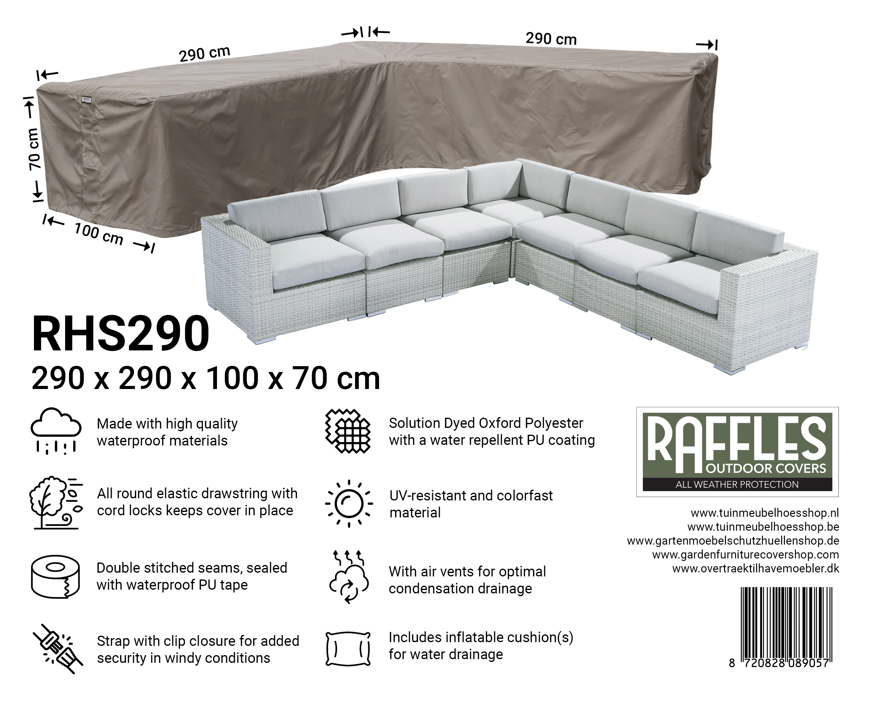 Met de RHS-serie hoekbankhoezen van Raffles Covers beschermt u uw lounge hoekbank of loungeset in L-vorm, van compact tot XXL, het hele jaar door. Of de hoekbank nu op het terras, balkon, onder een overkapping of in de open tuin staat: uw set blijft beschermd tegen regen, vuil, groene aanslag en zon.