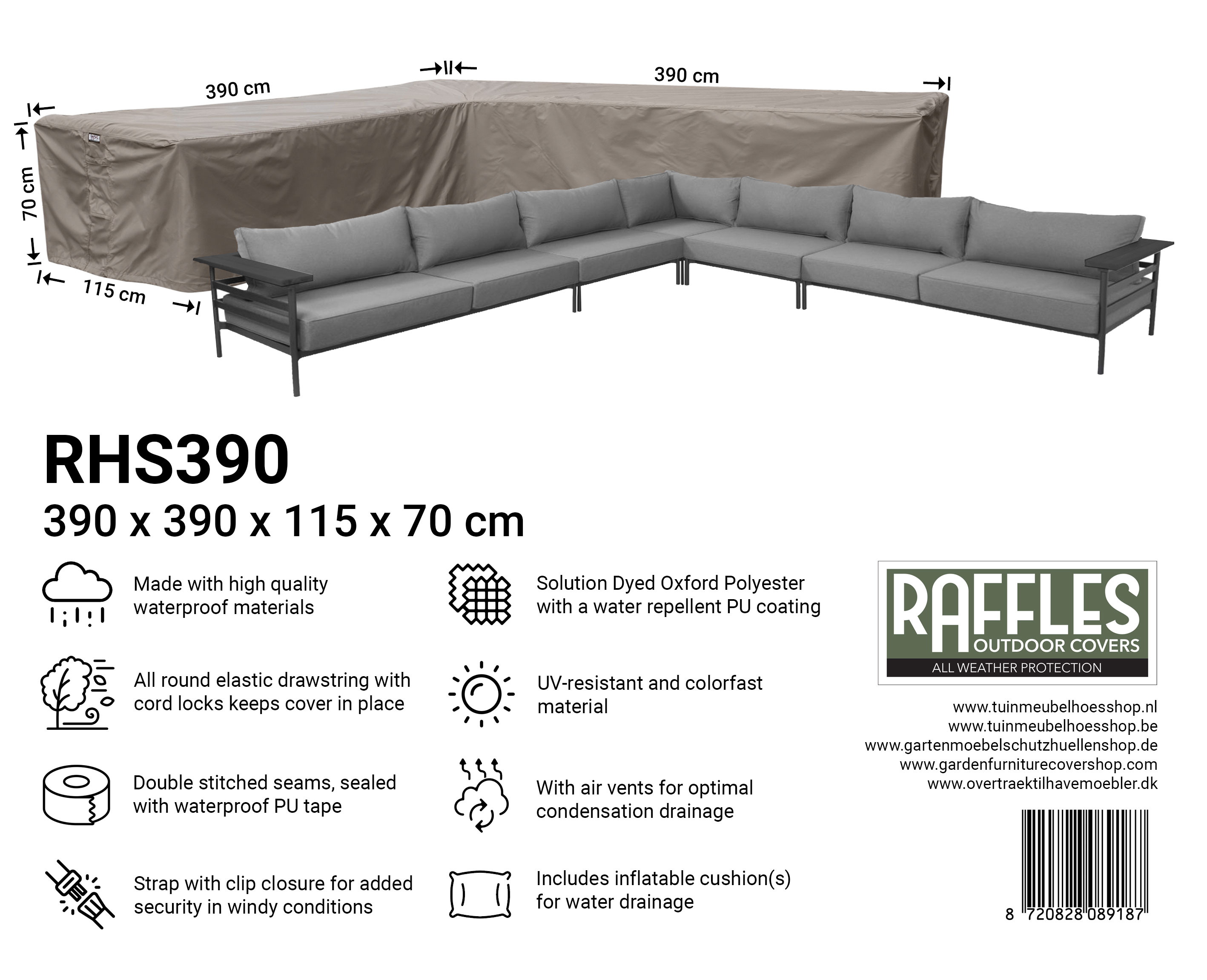 Met de RHS-serie hoekbankhoezen van Raffles Covers beschermt u uw lounge hoekbank of loungeset in L-vorm, van compact tot XXL, het hele jaar door. Of de hoekbank nu op het terras, balkon, onder een overkapping of in de open tuin staat: uw set blijft beschermd tegen regen, vuil, groene aanslag en zon.