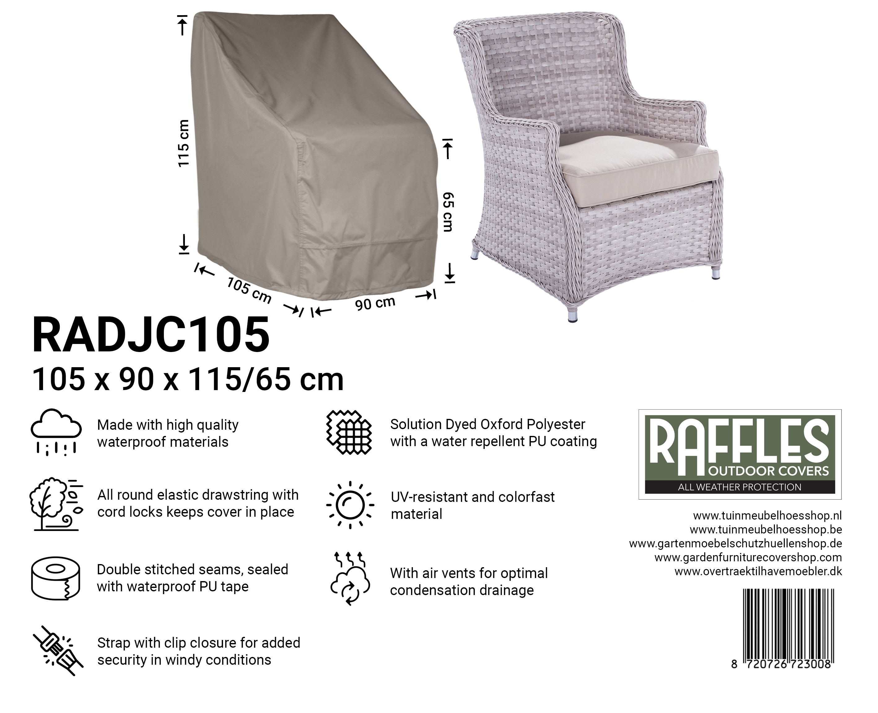Met de RADJC-serie loungestoelhoezen van Raffles Covers beschermt u uw verstelbare loungestoelen het hele jaar door tegen regen, vuil, UV-straling en vorst. De neutrale hoezen voegen zich rustig in iedere tuin en zorgen ervoor dat uw loungestoel in het voorjaar direct weer schoon en gebruiksklaar is.