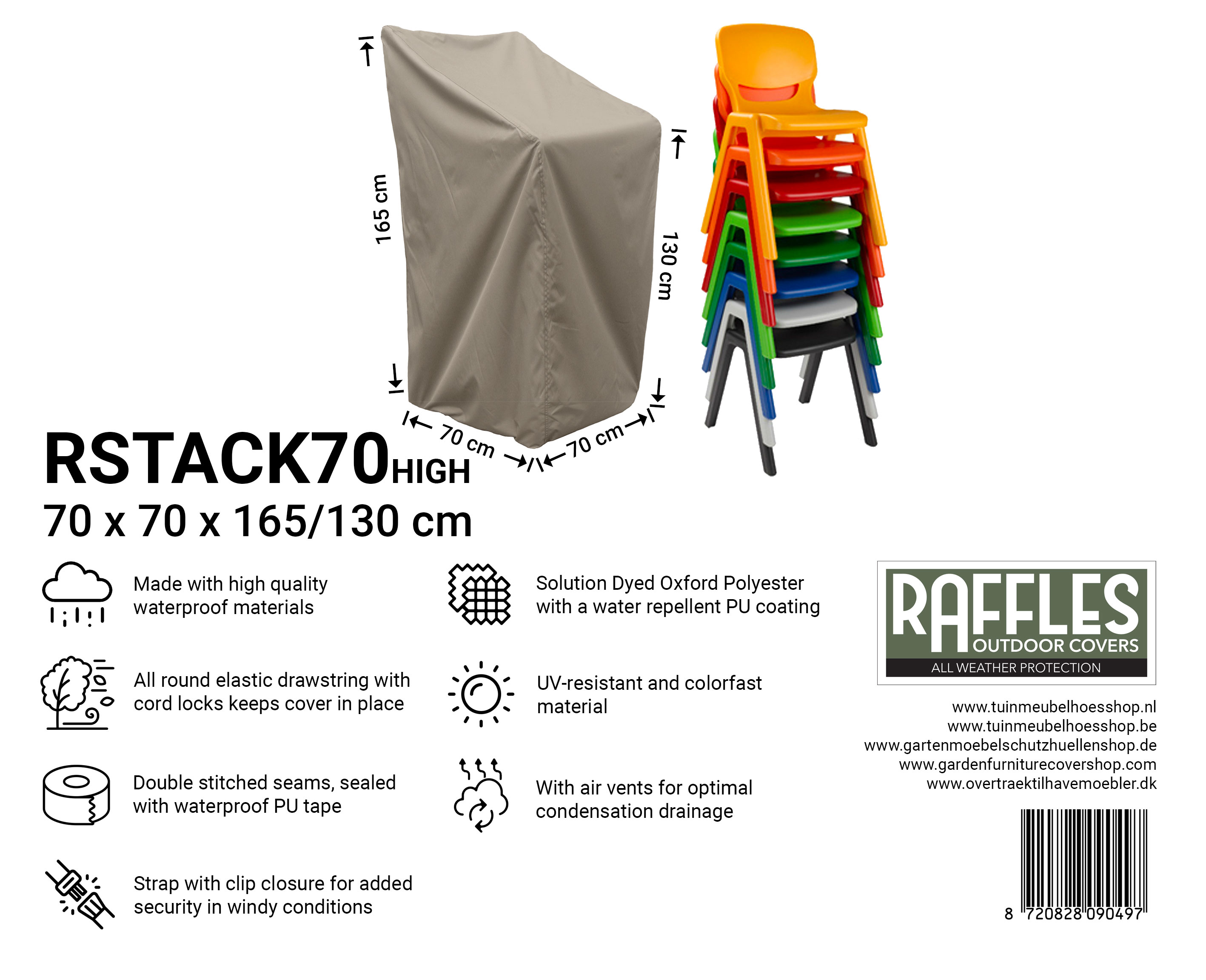 Met de RSTACK-serie stapelstoelhoezen van Raffles Covers beschermt u in één keer meerdere stapelstoelen tegen weer en vuil. Of u nu een compacte stapel van 4 stoelen of een hogere stapel tot ca. 8 stoelen heeft: er is altijd een passende hoes die uw stoelen beschermt tegen regen, zon, sneeuw, vuil, groene aanslag en vogelpoep.