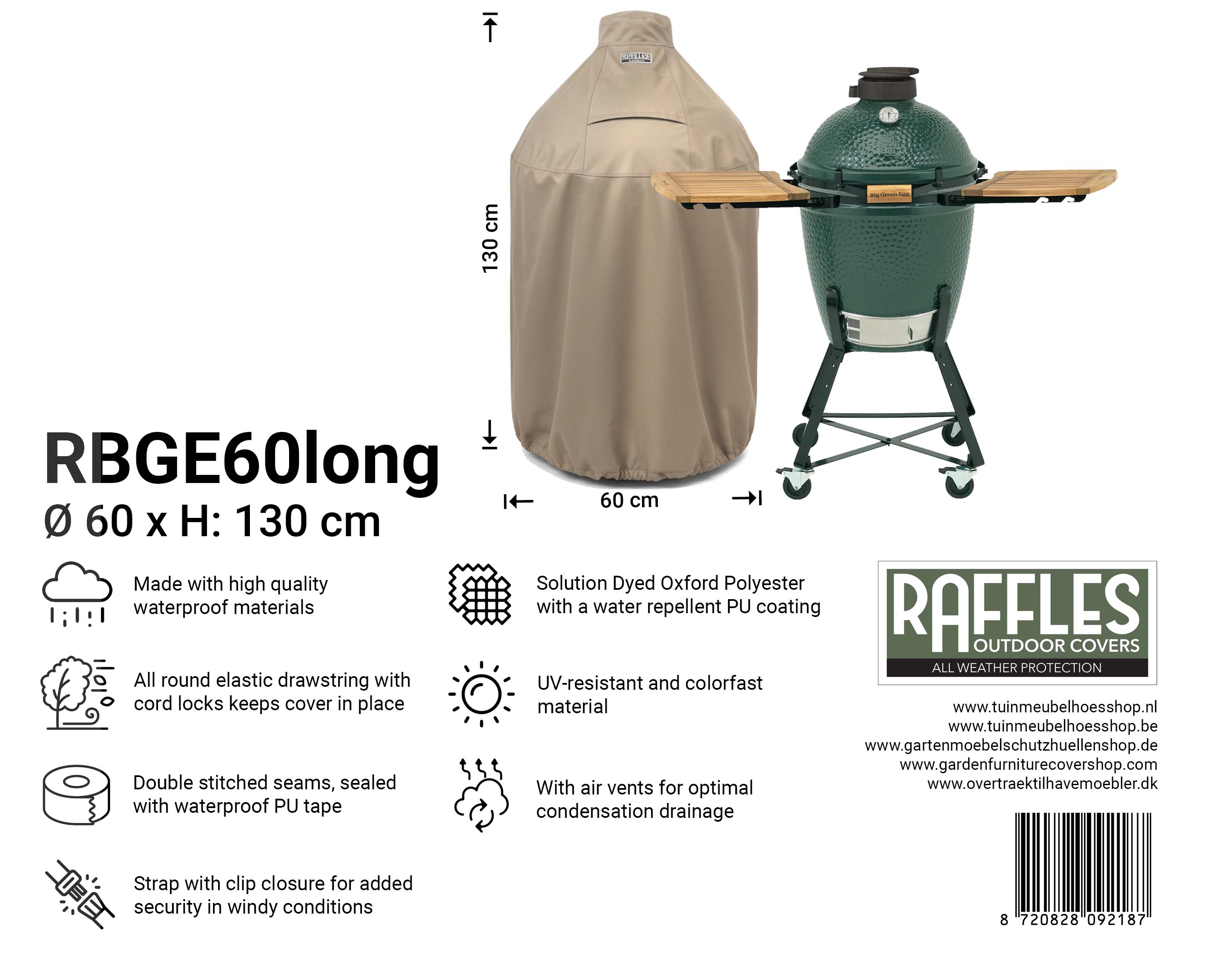 De Raffles Covers RBGE-serie is speciaal ontwikkeld voor ronde kamado-barbecues zoals de Big Green Egg, Kamado Joe, The Bastard, Grill Guru, Monolith, Primo en vergelijkbare merken. Of uw kamado nu vrijstaand staat, in een Nest op wielen of is ingebouwd in een buitenkeuken: binnen deze serie is er altijd een hoes die past bij de diameter, hoogte en opstelling van uw kamado.