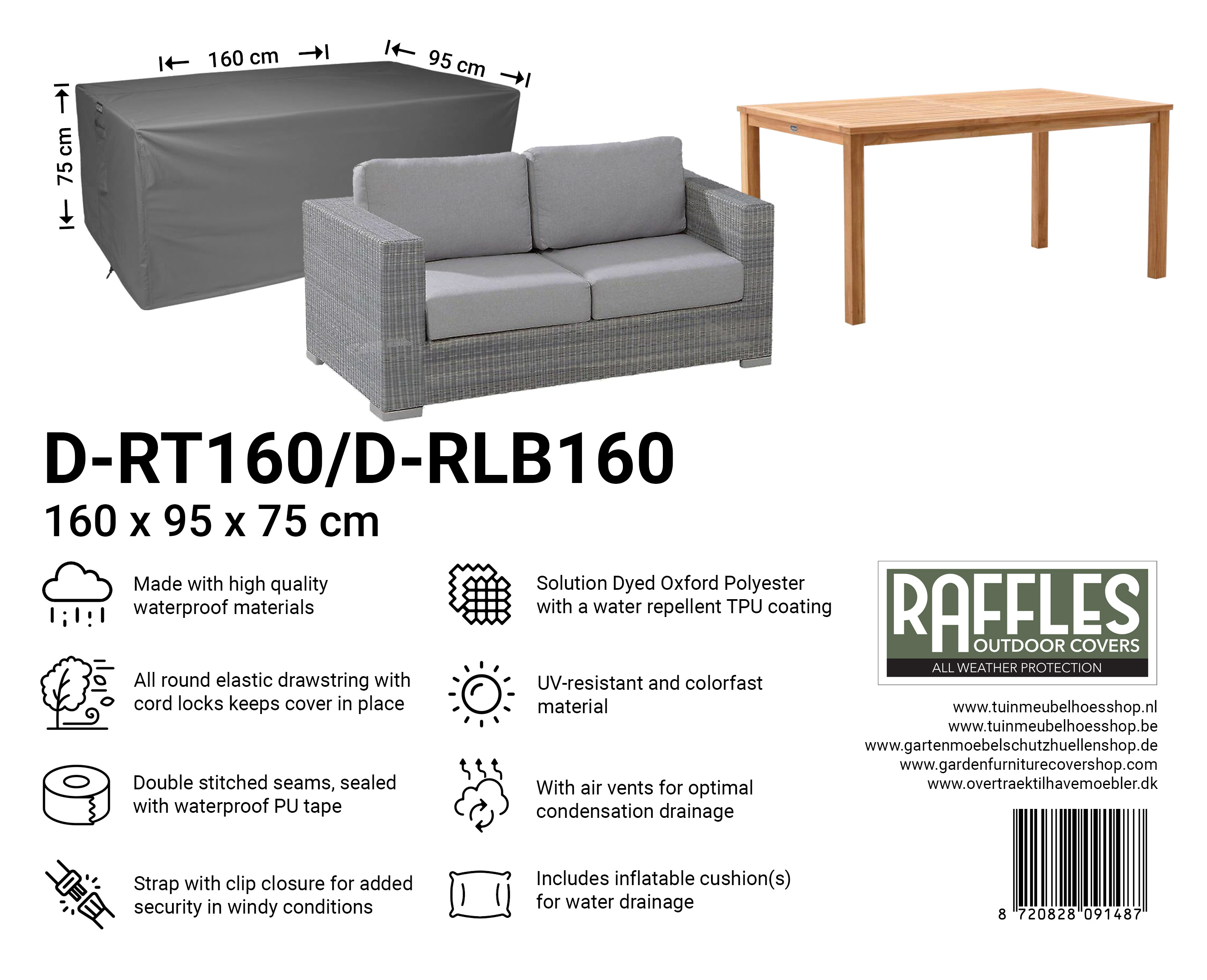 Met de RT-serie tuintafelhoezen van Raffles Covers beschermt u uw tuintafel(s) het hele jaar door tegen regen, zon, vuil, groene aanslag, vogelpoep en UV-straling. Of u nu een compacte bistrotafel, een standaard rechthoekige tuintafel of een extra lange XXL-tafel heeft: er is altijd een passende hoes, zodat uw tafel schoon blijft en direct klaar is voor gebruik.