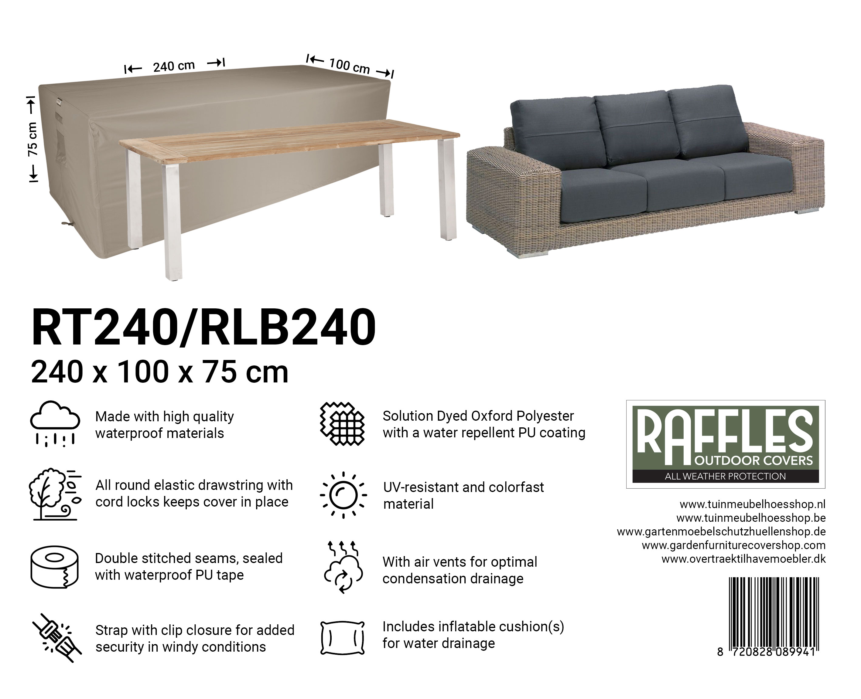 Met een Raffles Covers tuintafelhoes uit de RT-serie kiest u voor doordachte, duurzame en stijlvolle bescherming van uw tuintafel, zodat u in elk seizoen zorgeloos van uw tuin en terras kunt genieten.